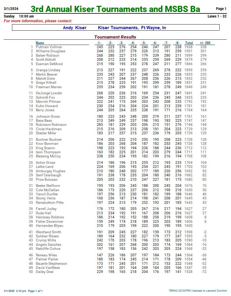 Match Play: Cut to top 15 (based on 60 teams), then teams are seeded into a bracket. Two baker game total pinfall, single-elimination matches for those who qualify.