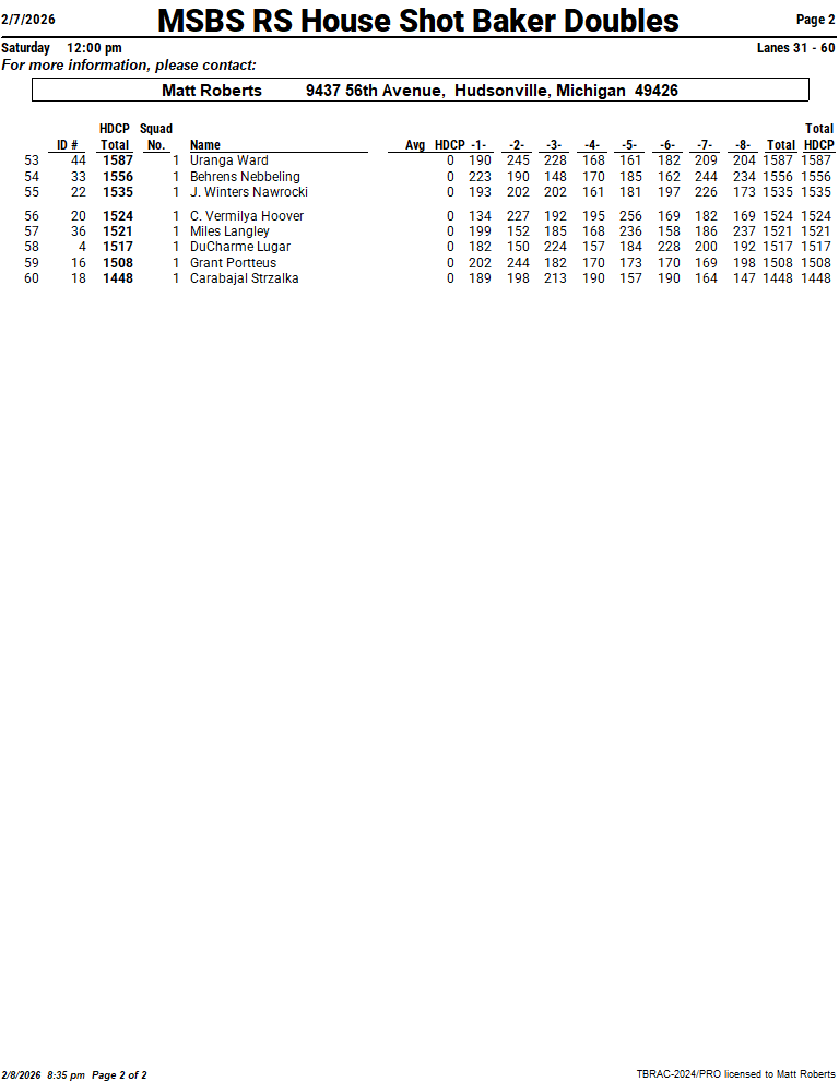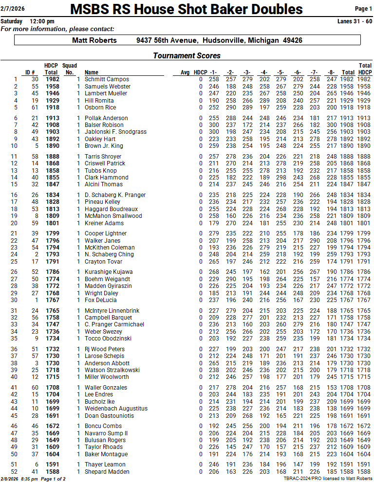 Match Play: Cut to top 15 (based on 60 team entries), then teams are seeded into a bracket. Two baker game total pinfall, single-elimination matches for those who qualify. We are capping match play to the top 16, as this event runs pretty long already.